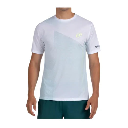 T-shirt Bullpadel Lagar Blanc : tissu bi-élastique, technologie Drynamic respirante et coupe ergonomique. Confort, style et performance pour le padel.